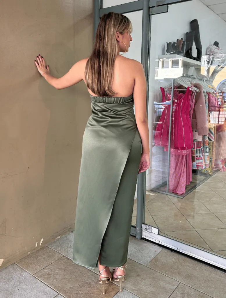 Fall in love with the Boudoir Dress. A form fitting balconette dress, with a tailored waistline and tucks throughout the body. Designed to create a flattering, feminine silhouette. The open back and ruched band across, bring a flirty allure to your look.