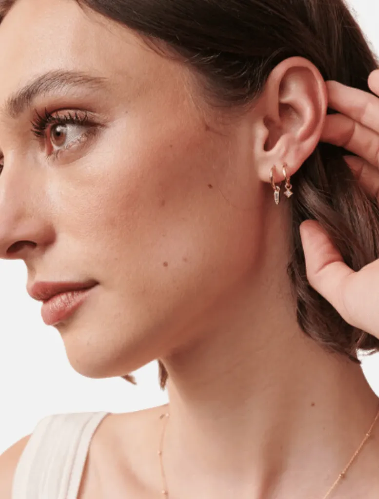 The Charlie Sleepers are a small huggie style with a hanging crystal bar shaped charm. Made from a brass base with gold/silver plating. A delicate simple sleeper great for stacking.