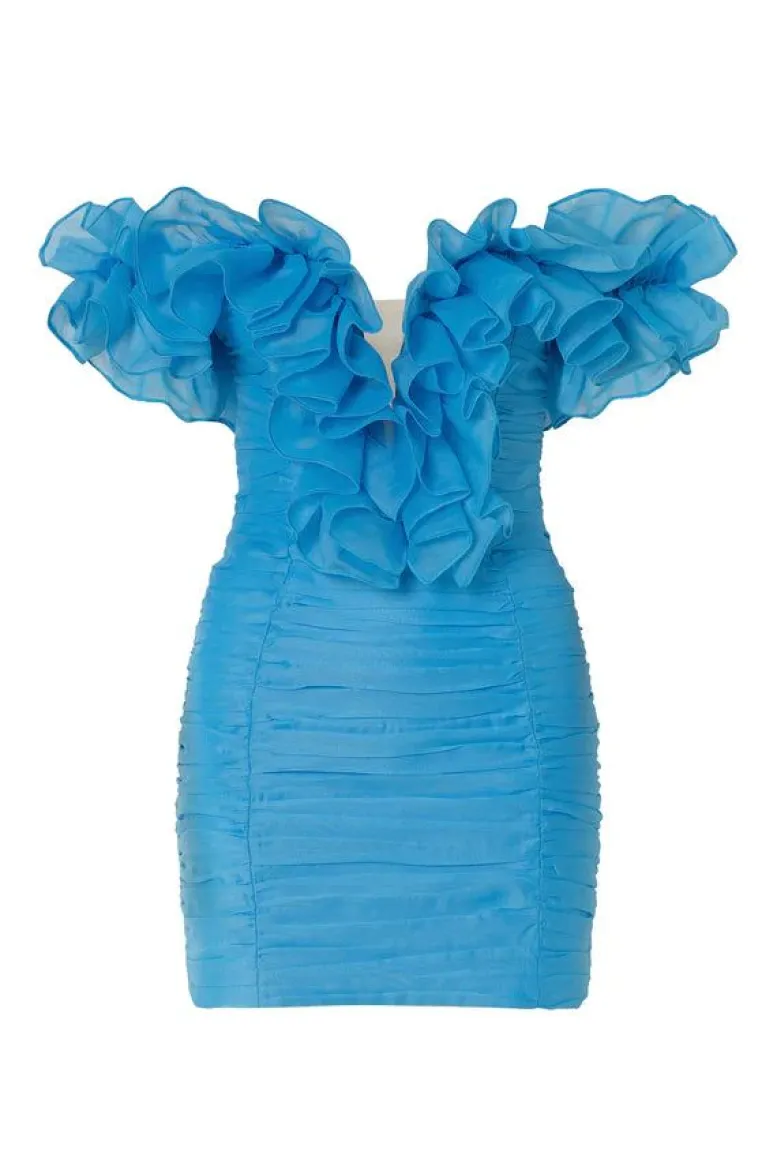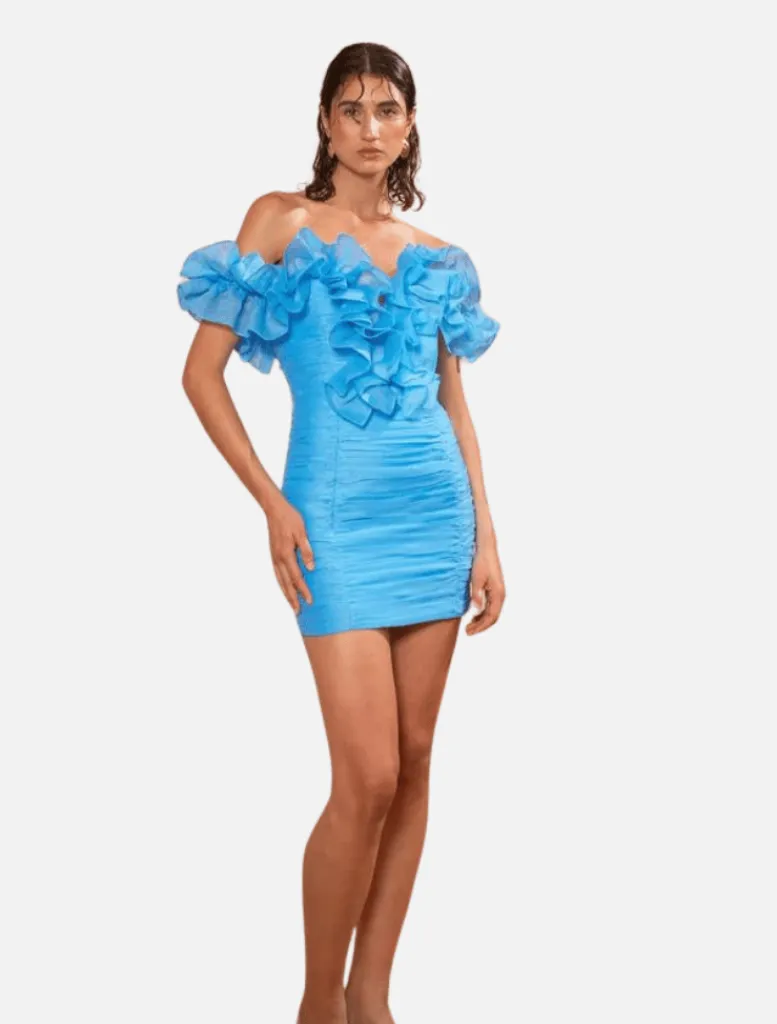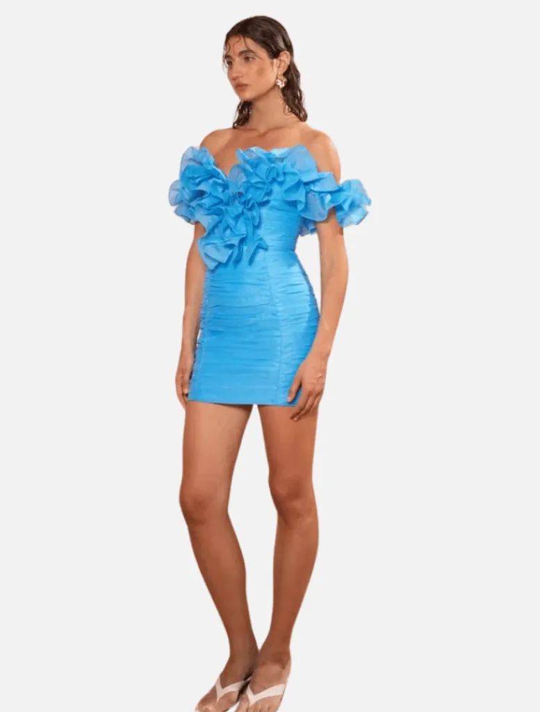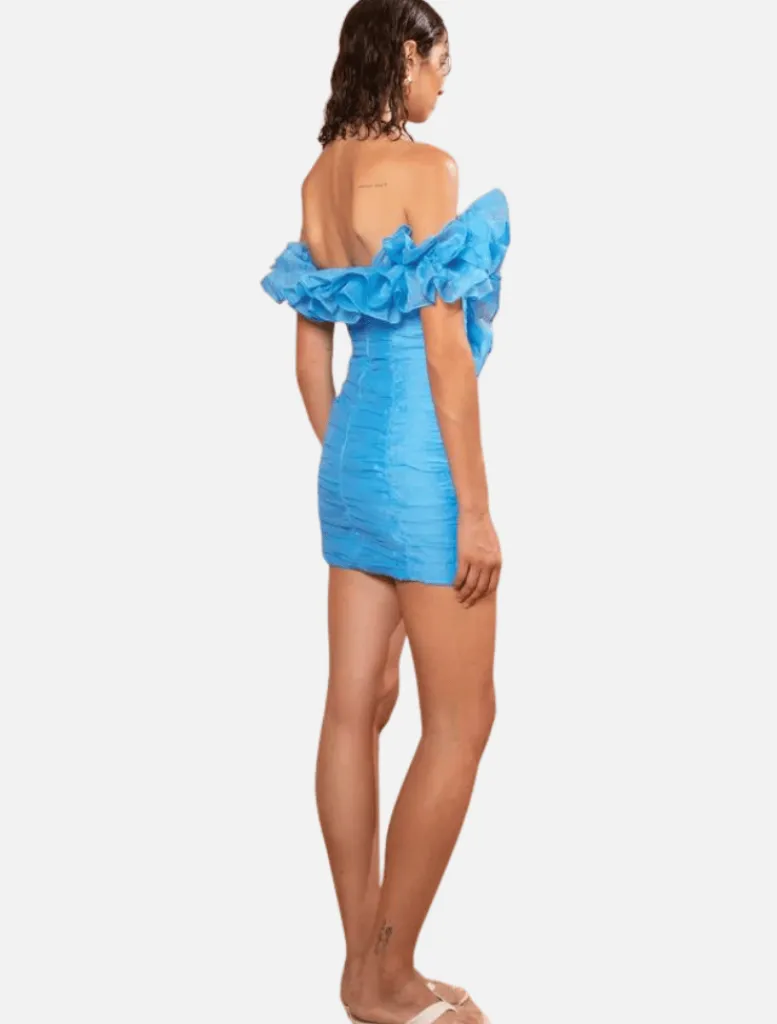 Introducing the Cuba Dress. Crafted with ruched details along the bodice and a structured boned bodice, making it not only a versatile piece but ensuring constant support and security. Embrace a hint of romantic flair with the Cuba Dress’ off the shoulder ruffle details, mini silhouette and captivating shade of azure blue.