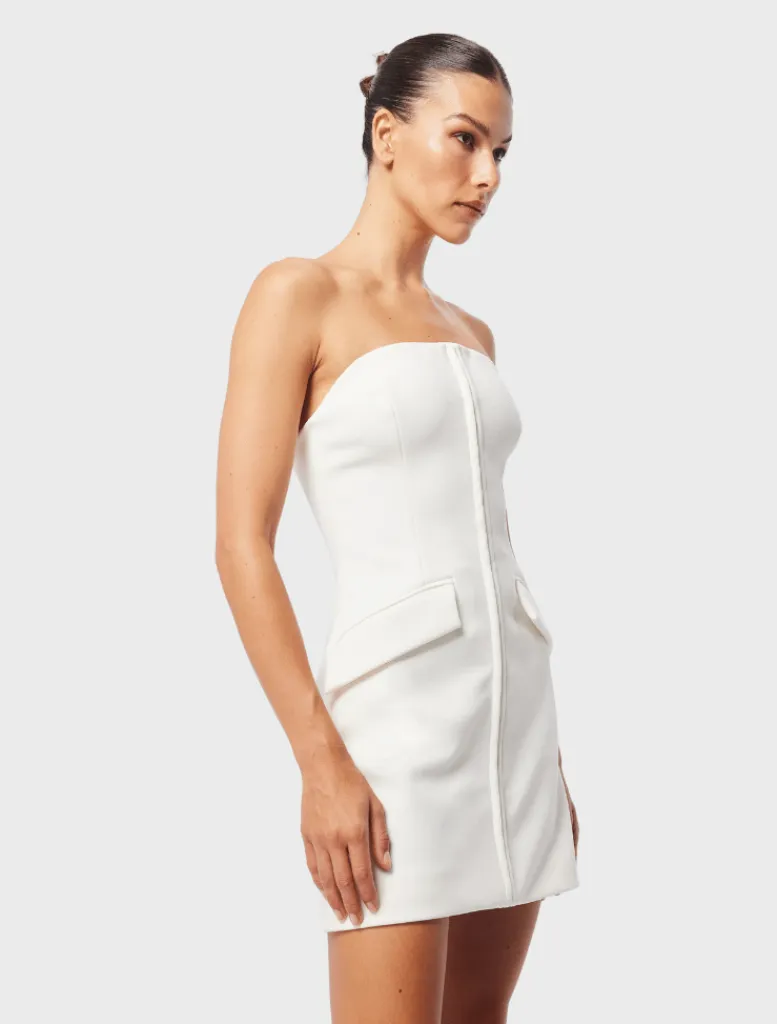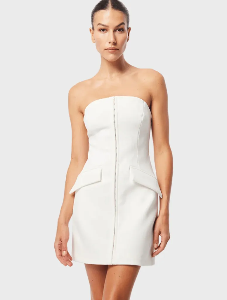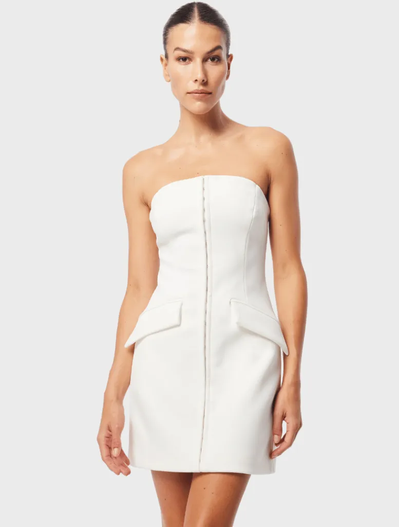 Add a touch of refinement to your wardrobe with the red Linear Mini Dress. With a strapless neckline and a body-skimming silhouette, it creates a flattering shape. Featuring a hook eye-front trim detailing and functional slash pockets, this dress is a versatile piece suitable for day or night events. Pair it with a blazer for office chic or with sharp heels for your next date night.