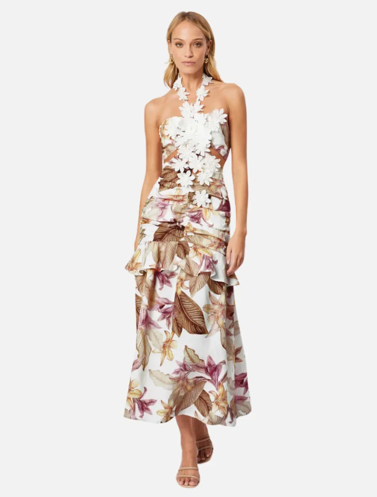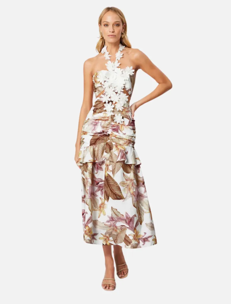 Adorned with exquisite 3D floral appliqué scattered across the front bust and waist, this midi cocktail dress is a botanical masterpiece. The floral halter neck tie detail adds a whimsical touch, perfectly complementing the floral motif.