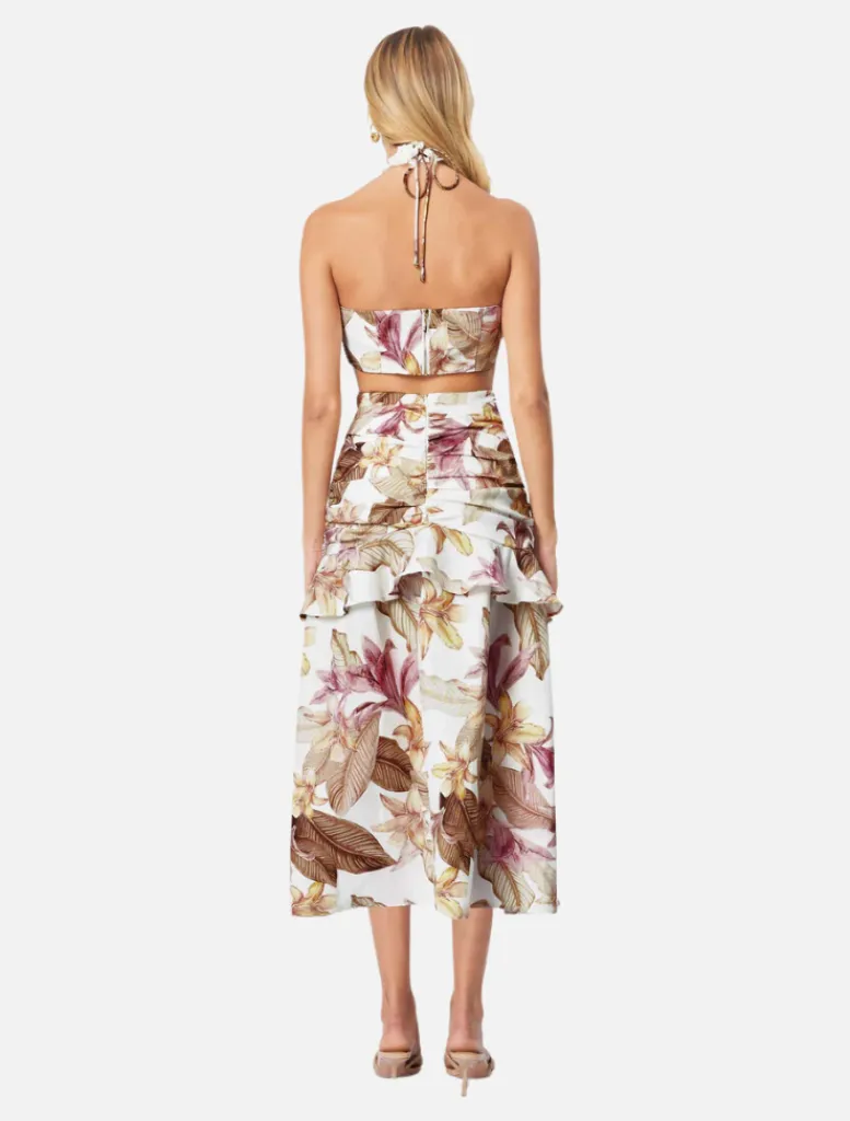 The fitted bust panel accentuates your curves, while the centre back exposed metal zipper adds a touch of contemporary flair. A waist cutout detail subtly draws the eye, lending a hint of allure to the ensemble. The fit and flare midi skirt with a gathered waist panel drapes gracefully, flattering your silhouette with every movement.