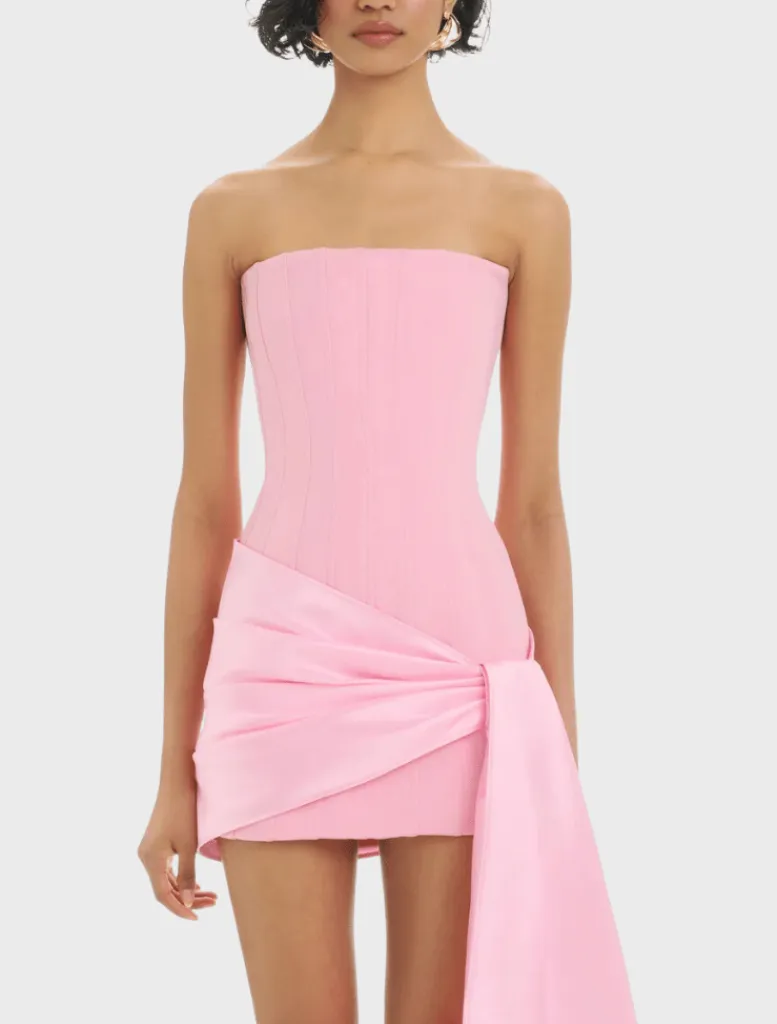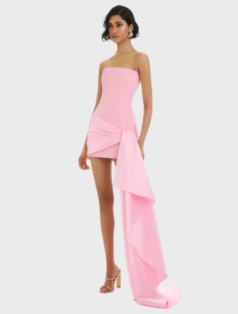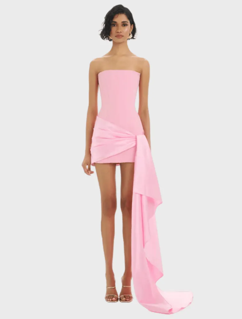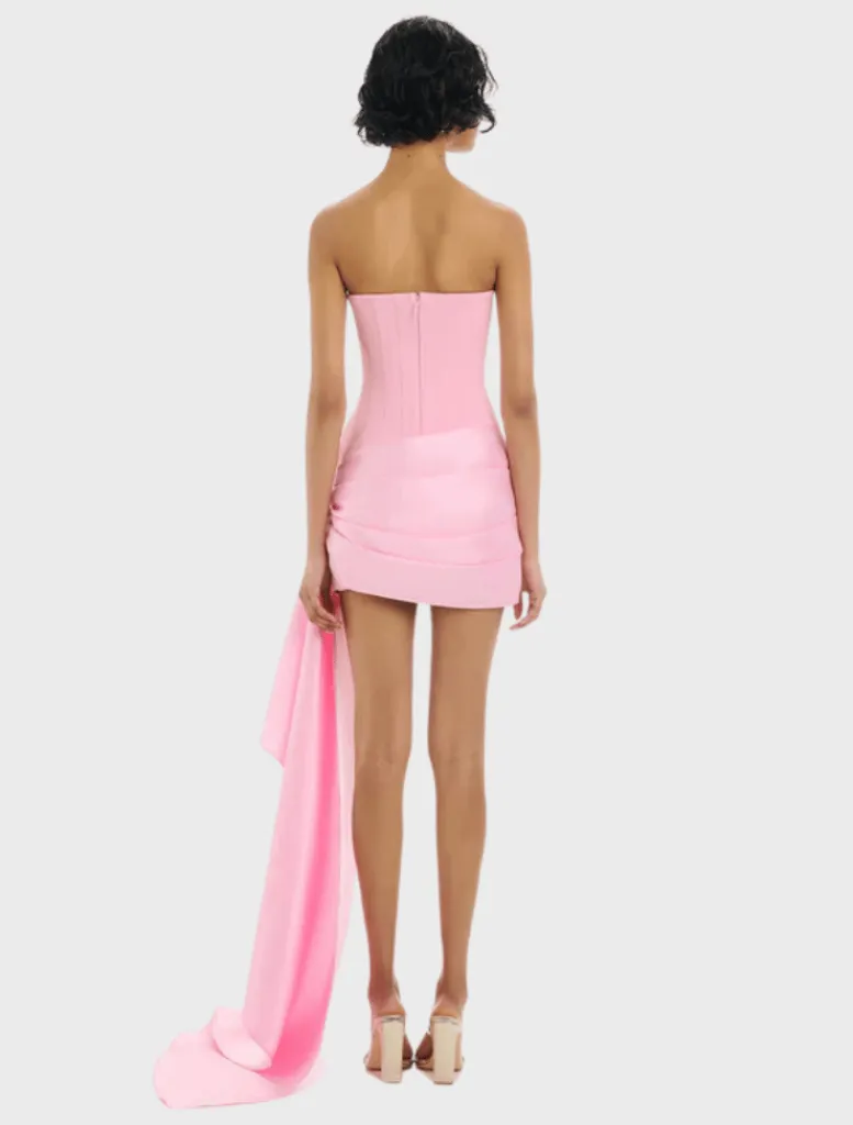Meet the Midina Dress, a strapless mini dress that has been crafted with boning from the neckline to hemline for impeccable structure. Featuring a pink draped asymmetric satin sash that cascades into a floor-length train adds extra allure to the dress. Fully lined and finished with an invisible zipper at the centre back, the Midina Dress combines both elegance and modern femininity.