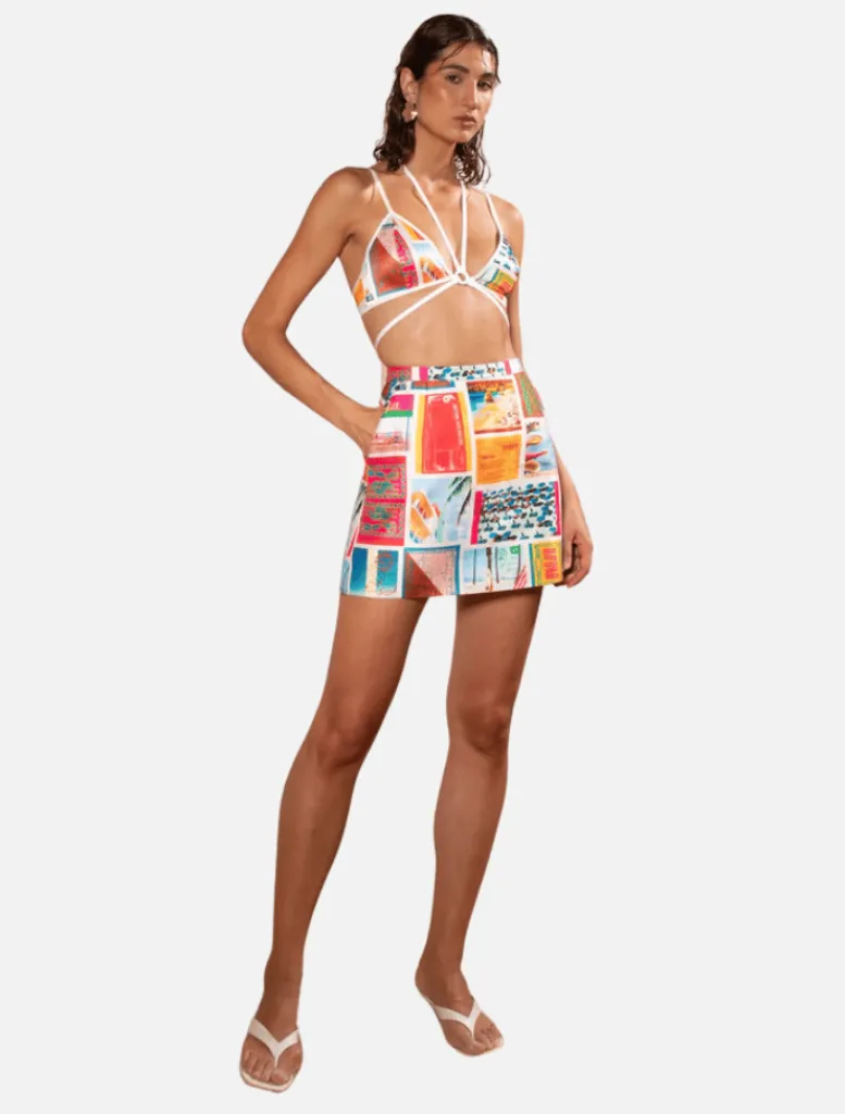The Monaco Skirt features a high waistline and finishes into an A-line mini silhouette. The style is complete with lining on the inner whilst also featuring a sleek metal zipper at the centre back. The Monaco Skirt is designed in our new signature Vacanza print. Each wear transports you to the serene landscapes of the Mediterranean, creating a fashion-forward piece that is both stylish and evocative. Add the Como Bralette and/ or Taormina Shirt to your look to complete the set.