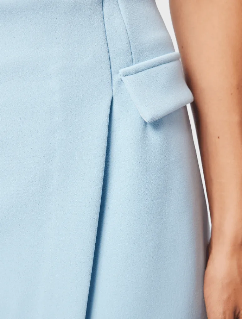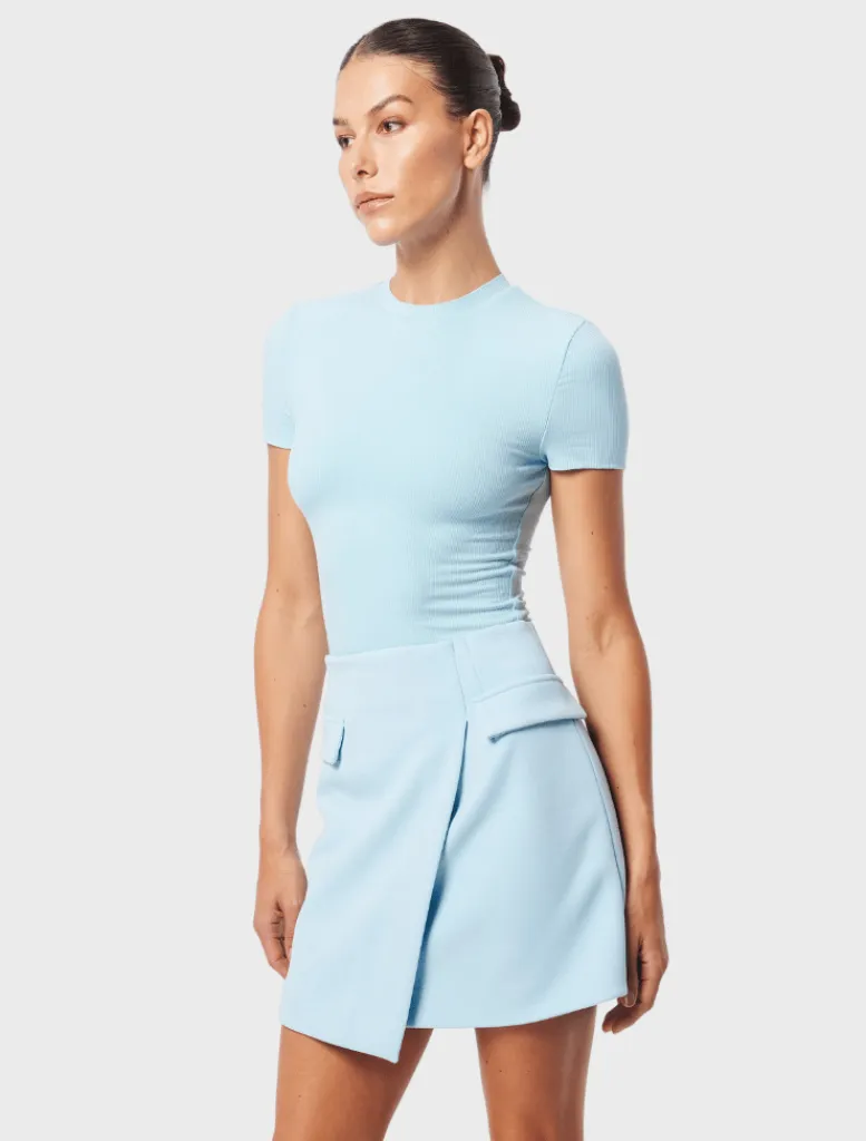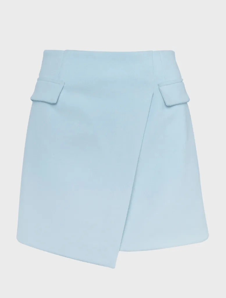 Our iconic On My Way Mini Skirt is now available in a soft mist blue. Fully lined, it has a tailored A-line silhouette and an asymmetrical faux wrap front. For a sophisticated ensemble or pair with a simple tank for warm weather style.