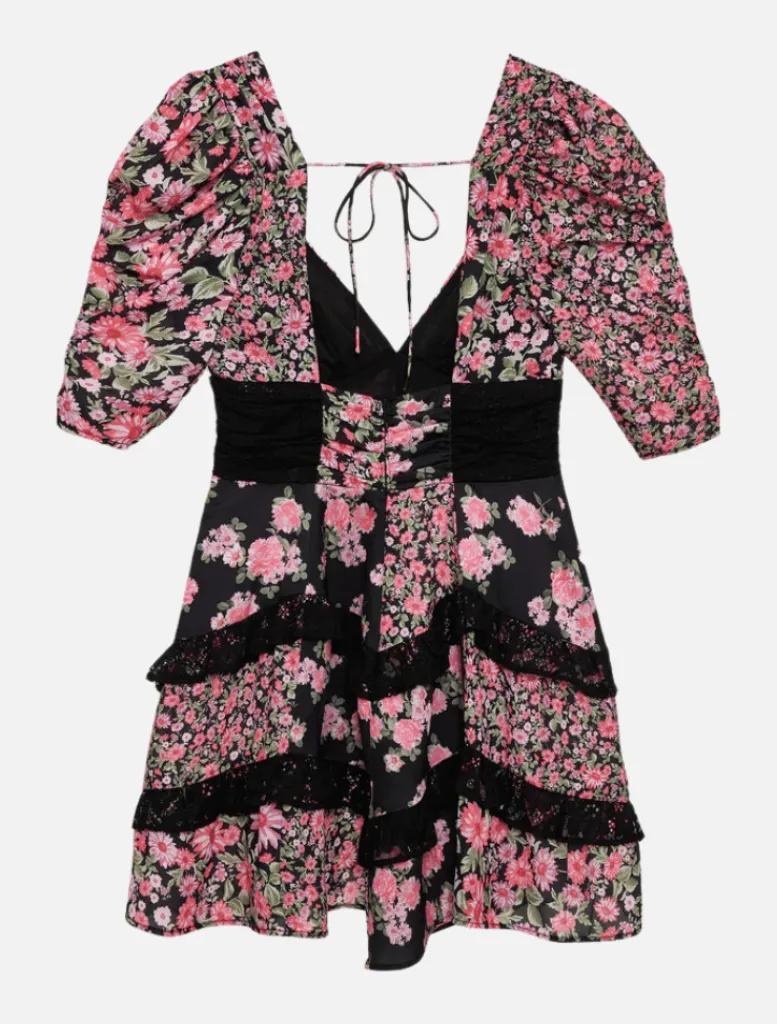 She’s Back Baby and now in a pretty Black Floral! The best-selling For Love and Lemons Rosalyn Mini is ready to be your perfect wedding guest dress for the season! Secret garden patchwork vibes filled with Spring Brightness! Lace plays throughout the silhouette. Very fem-shirred details on the bust and handkerchief ruffle him, and a dramatic low back with a delicate tie!