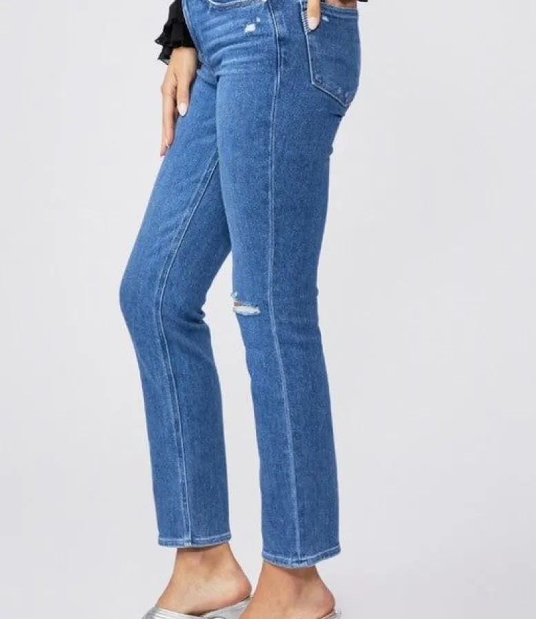 Your new everyday jean. Crafted in PAIGE Vintage denim with a mid-rise waist, this straight leg pair creates an effortlessly cool look in the perfect medium blue wash with natural distressing and a knee slash. PAIGE Vintage takes all of the work out of breaking in your favourite pair of vintage jeans.