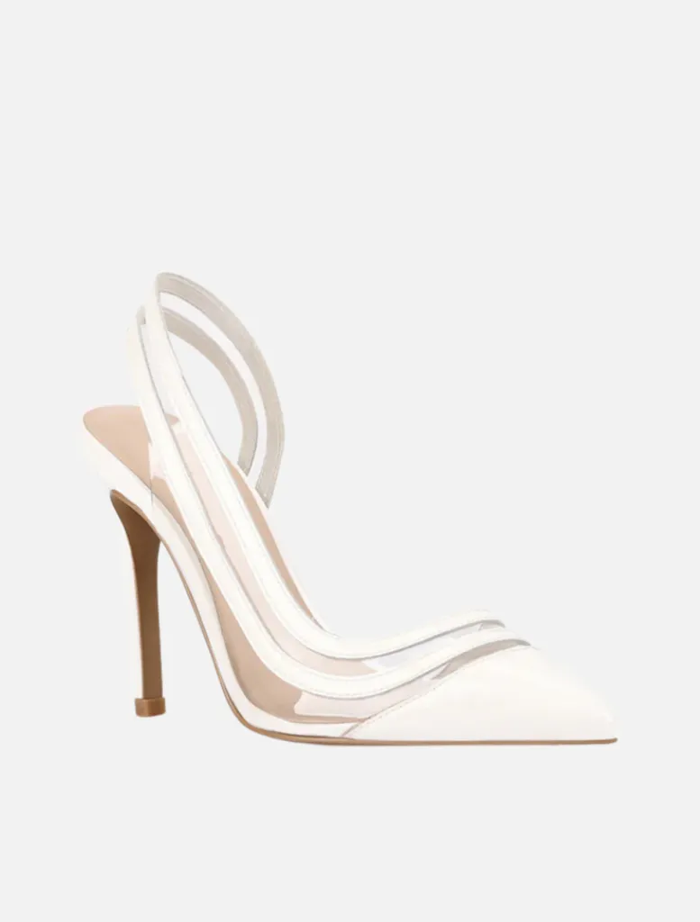 Savannah is crafted in polished patent leather and accented with crystal-clear vinylite, this style defining pointed-toe pump will take you from desk to dinner with its two-tone upper, feminine slingback silhouette and high stiletto heel.