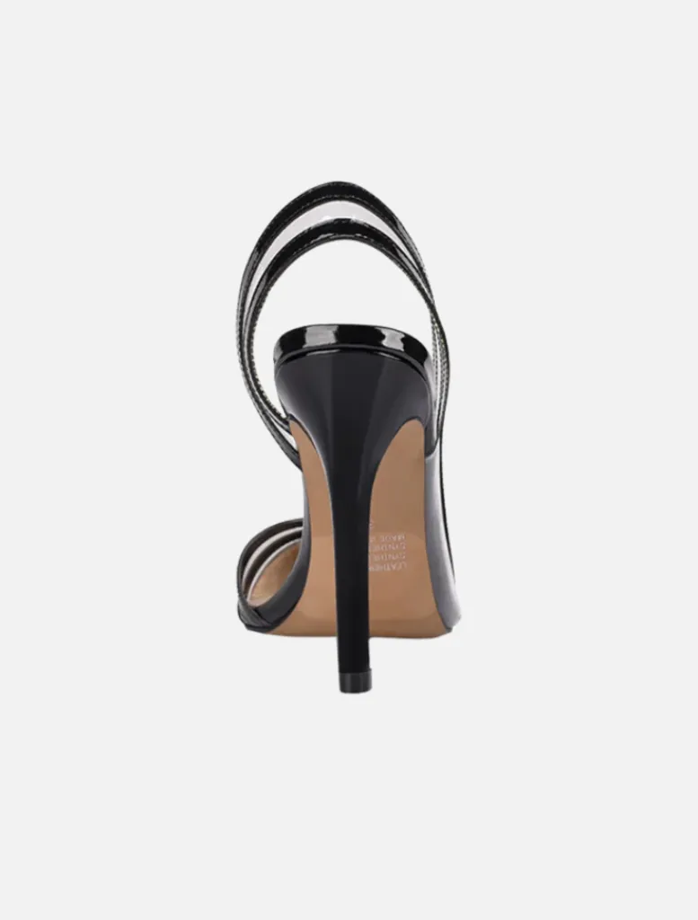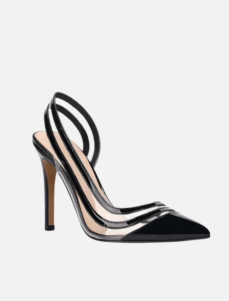 Savannah is crafted in polished patent leather and accented with crystal-clear vinylite, this style defining pointed-toe pump will take you from desk to dinner with its two-tone upper, feminine slingback silhouette and high stiletto heel.