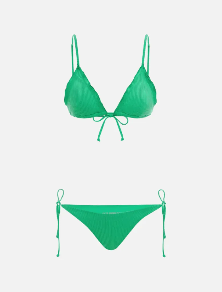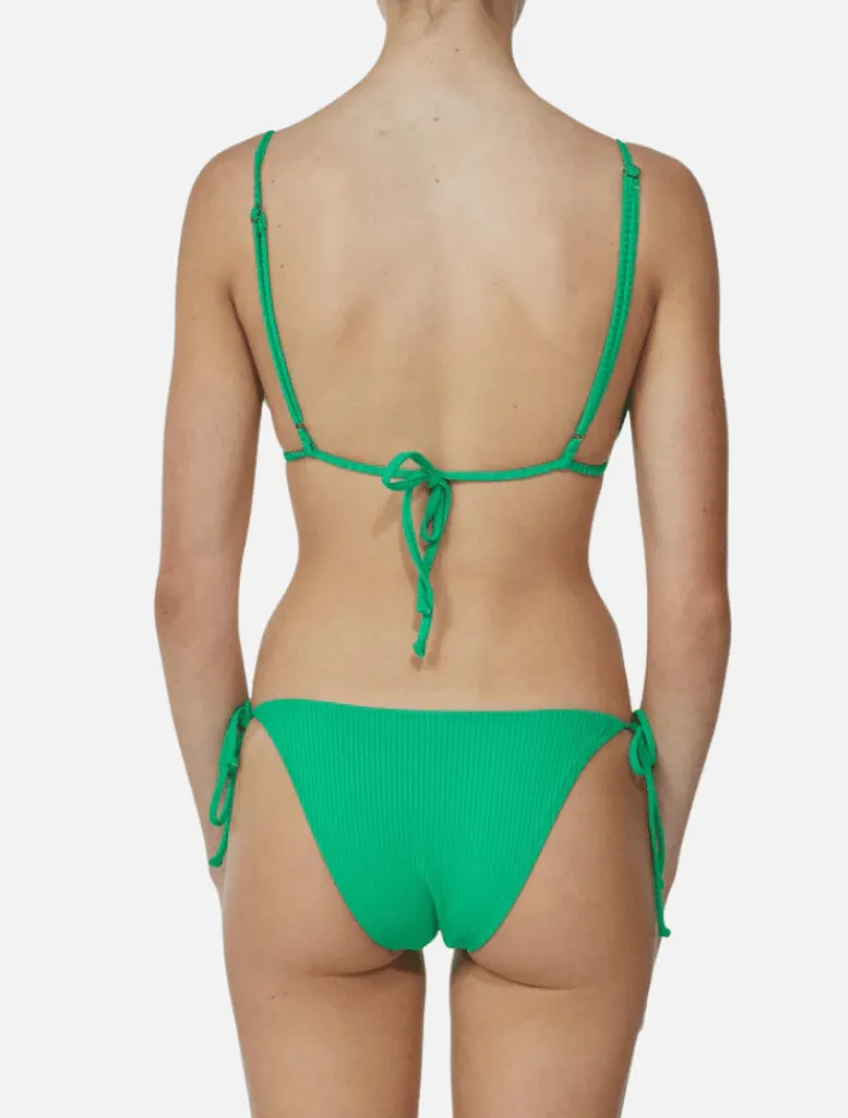 This new take on the string top has adjustable string style shoulder straps and tie back for a flattering fit. The style comes in a 90s inspired lettuce edge cut in our ECO rib fabric. This string-style bikini features super flattering removable padding in the cup.
