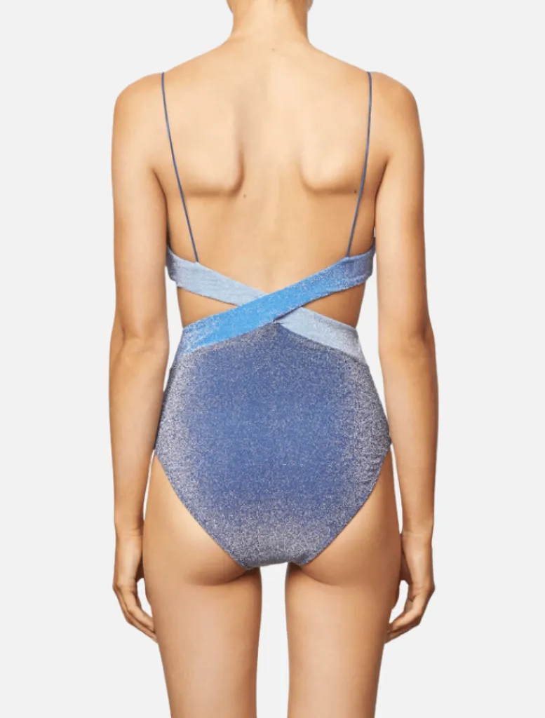 Introducing the Riot One Piece, made in our metallic lurex fabric, with luminous contrasting blue-hued colour blocks, with figure flattering cut out sides.