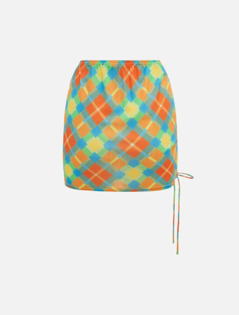 The Rouch Skirt, designed to be worn from beach to bar! The adjustable ties can be cinched in to create the perfect fit. Featuring our eye-catching tartan print in vibrant orange and blue tones.