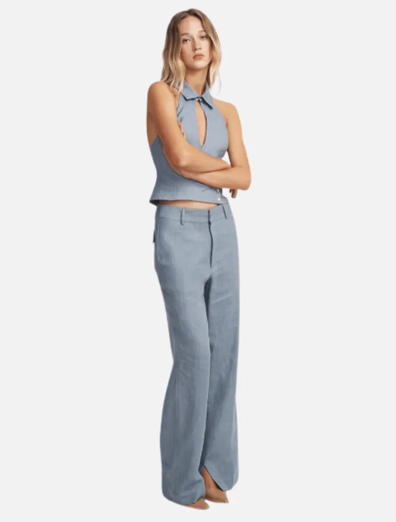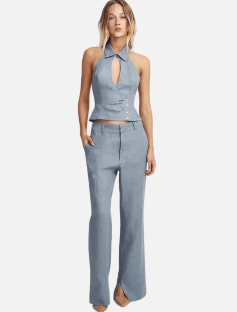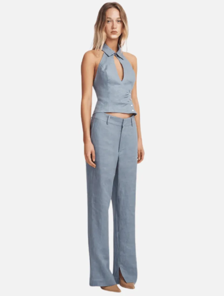 The Tully Halter Top is a halter neck style top that wraps at the front with a button closure. The top is fully lined for ease of wear and can be worn closed at the neck or open making it a versatile styling piece. Pair with the matching Baxter Linen Pant for a cool tonal set.