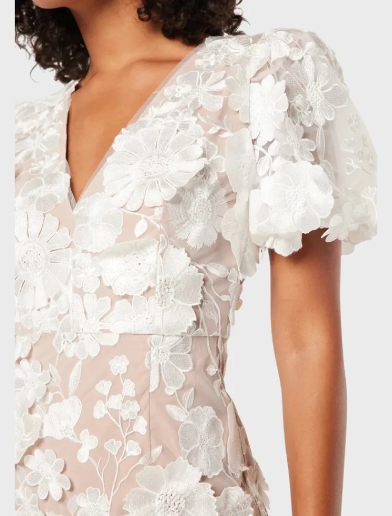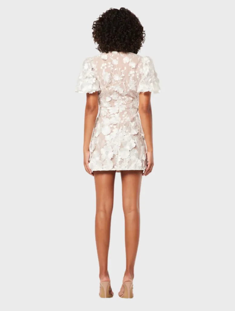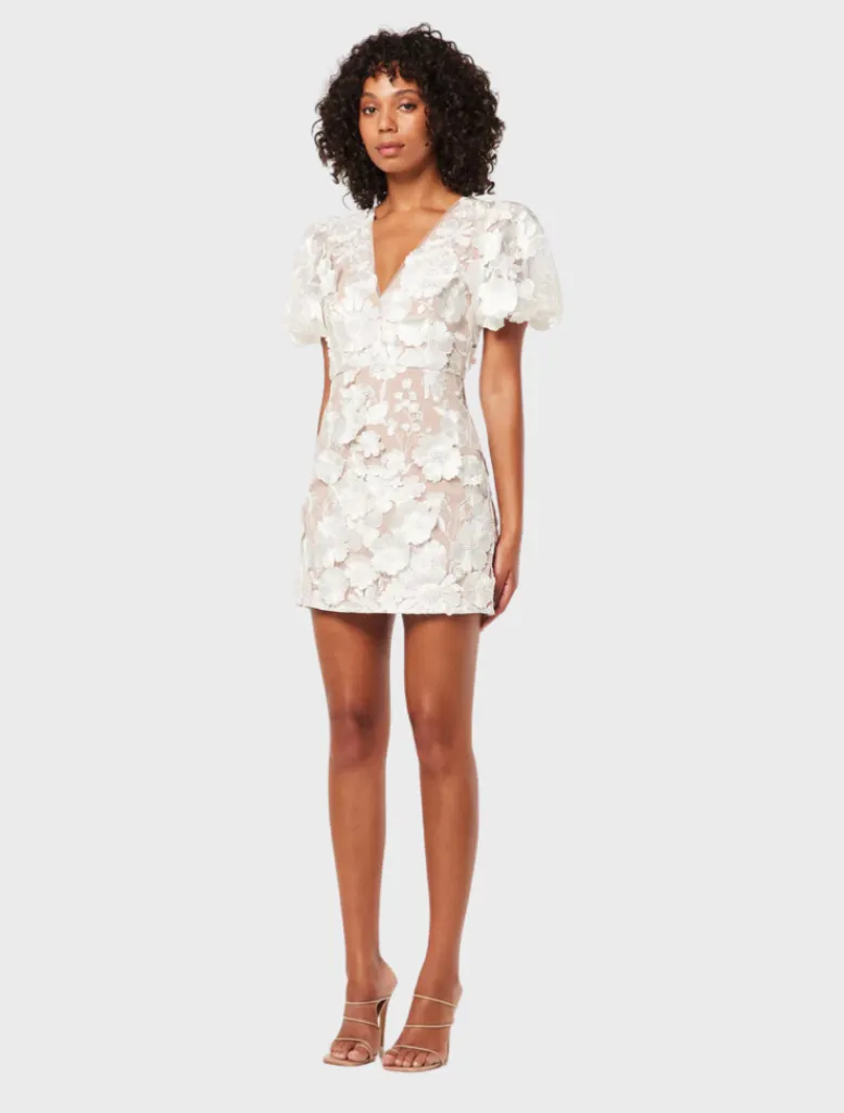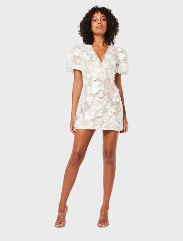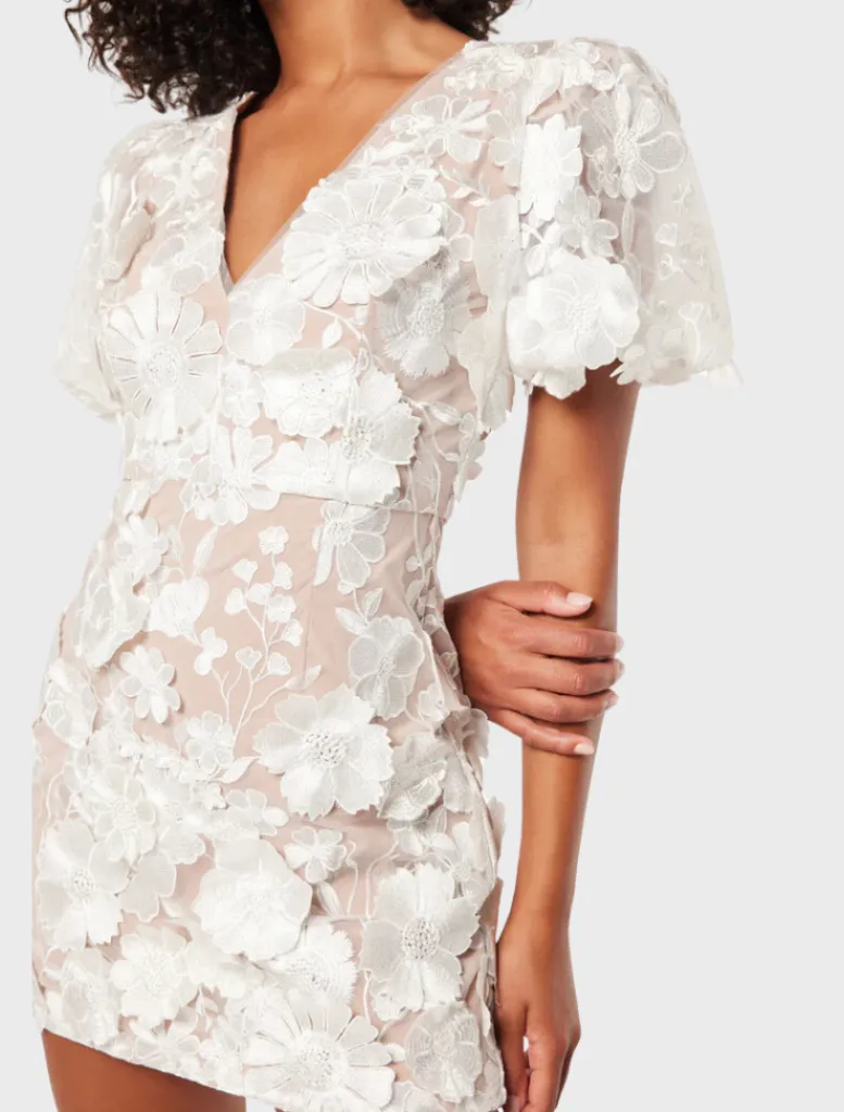 shaped necklineShort puffed sleeves Mini length Fitted style 3D lace100% POLYESTER